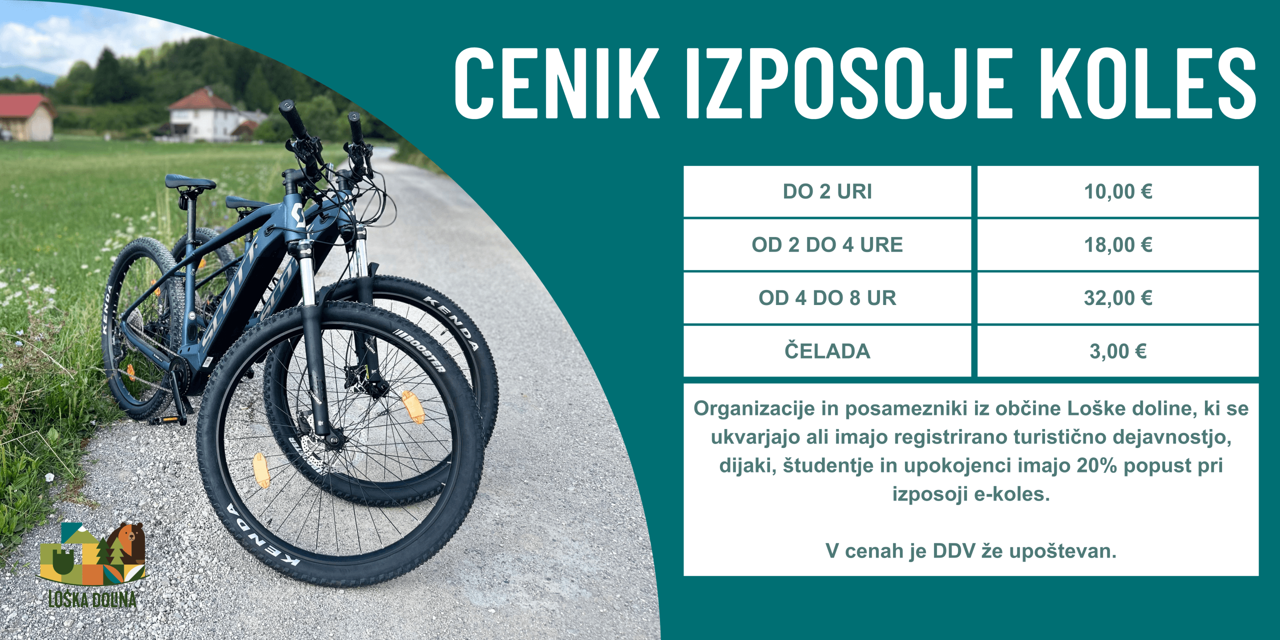V TIC Loška dolina so za izposojo na voljo 4 e-kolesa znamke SCOTT Aspect eRide 930 v velikostih od S do L in 4 kolesarske čelade.